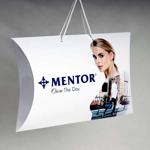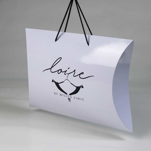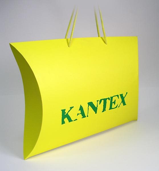 XL2 pillow box je velika elipsoidna kutija sa ručkama od pamučnog kanapa. Dimenzije kutije su 530x350x310mm (vidi→ skicu standardnih dimenzija). Ova štancovana kutija je izradjena od 350 gr/m2 kunstdruka, osnovna štampa u jednoj boji, sa sjajnom plastifikacijom 1/0.